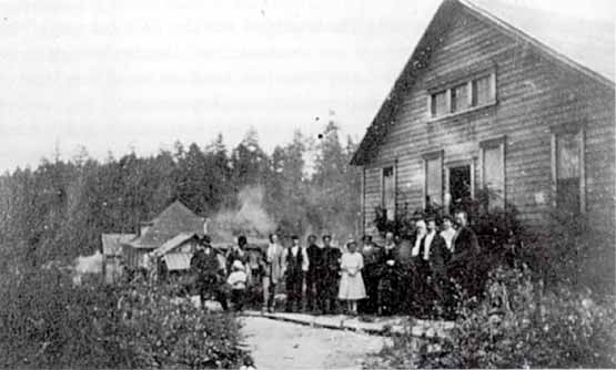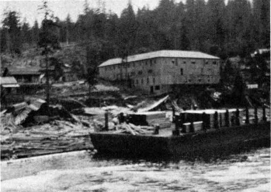 Over a million feet of lumber was dumped into the sea when the wharf collapsed. Some of it can be seen between the scow and the shore. The wharf collapsed in 1926. The large building in the background is the bunkhouse. The bunk house was horseshoe shaped and could accomodate 150 workers.