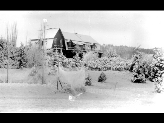 this was another view of the house again. Now this is later than the first one because this is the front of the house but you can now see the IV starting to the paths are starting to grow up. And there's there you see it in its full glorious stage with the with the with the driveway round. And of course the upstairs rooms. He would not have your he taught you a lot of remittance men, and he charged them a room and board. And of course we met this man, we're usually second third sons of wealth to doing this families that weren't going to inherit the big the big thing at home but got sent over here with a stipend. And we've got Central Australia, Canada, Australia being the two big dominions. And there we are another view and we've got a bargain of some kind here. Something out there. And originally the house was lit by acetylene. But Bullock was the first man to acquire electricity. He got a gasoline fired motor to run a generator. So he had electricity. He was the first one with a phone line to connect the Ganges and eventually there were several fireplaces in the in the place. Now you gotta view there's the firemen going on in the front field. This is this is Willie Palmer, this would be taken on this camera here. As we have the glass speak negatively, my dad has some bullet bullet got into this photography thing and he realized my dad was good at it. And he bought him a camera which is that one there. And we have something like more than 200 glass plate negatives from that camera. And that's really talking Hey, there's the tennis court on the left I think that was the livery or graduate the right there on the barn. The lake is off to the right behind me and there there it is in the wintertime