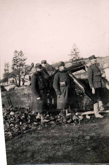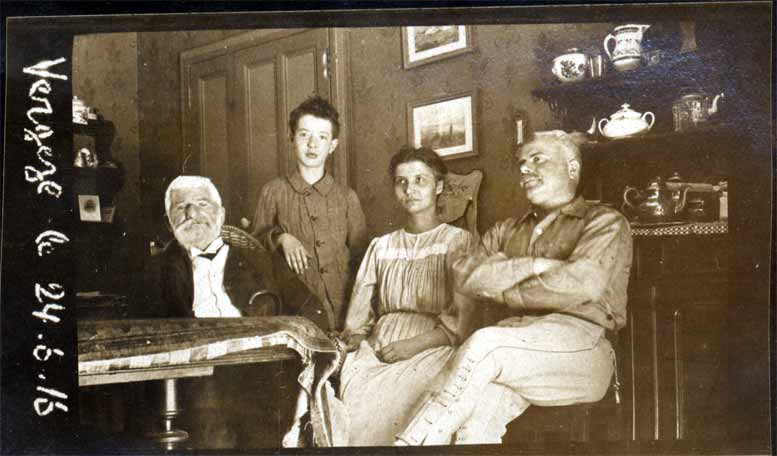 From Left to Right: Pierre Felix Bion (Paul's father), Samuel Bion (son of Edouard and Nancy), Nancy Bion (wife of Edouard Bion, Paul's brother), Paul Bion. Taken at Vergèze, Gard, in June 1916. (Note courtesy of Peter Bion 2011)