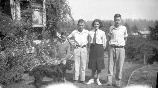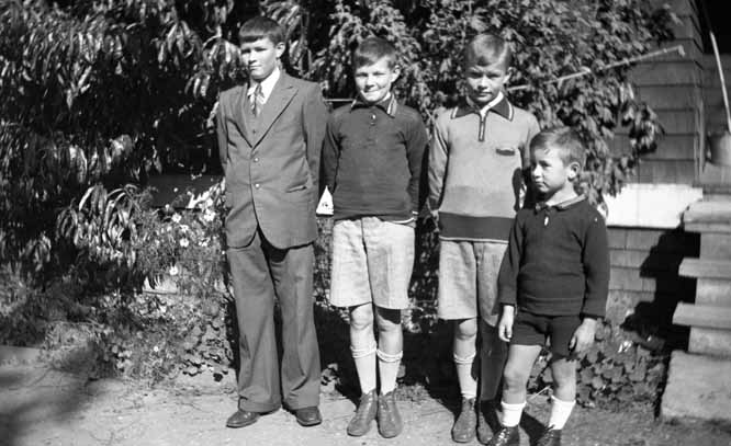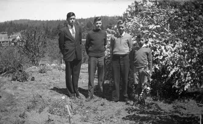 Vernon Drake (1921-2013), Bruce Drake (1923-1943), Colvin Drake (1924-1992) and Louis Drake (1929-1987) in the Drake yard.