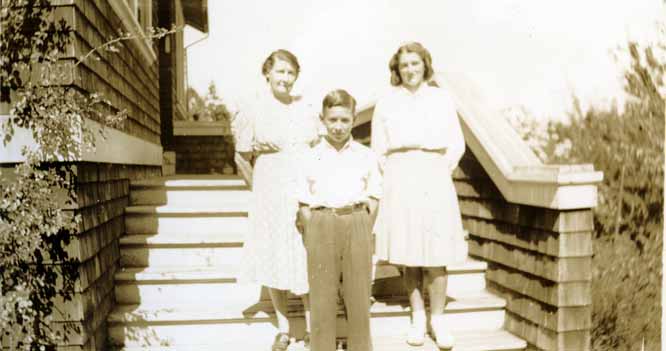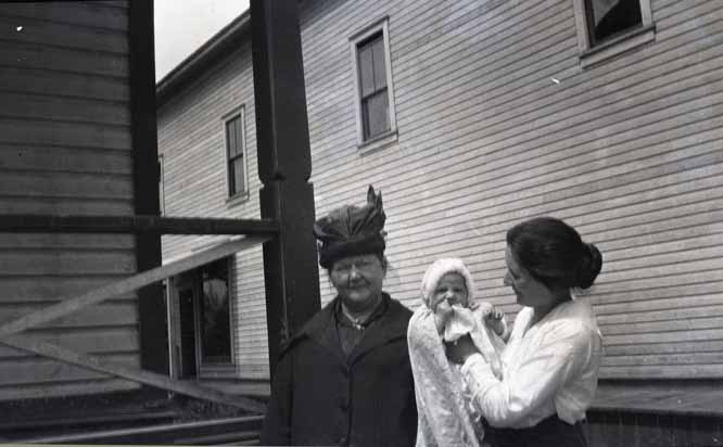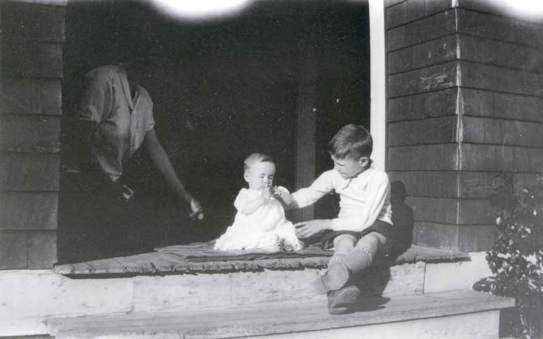 Baby Louis Drake with brother Bruce Drake and mother Lydia (Mouat) Drake in the shadows on the front step of the Drake house.