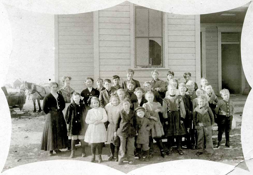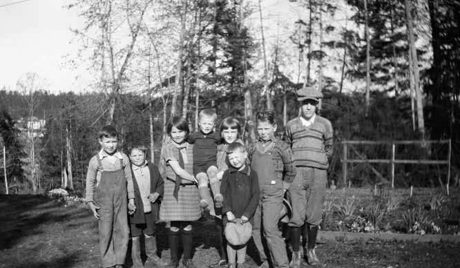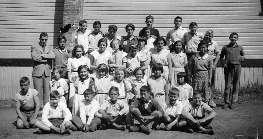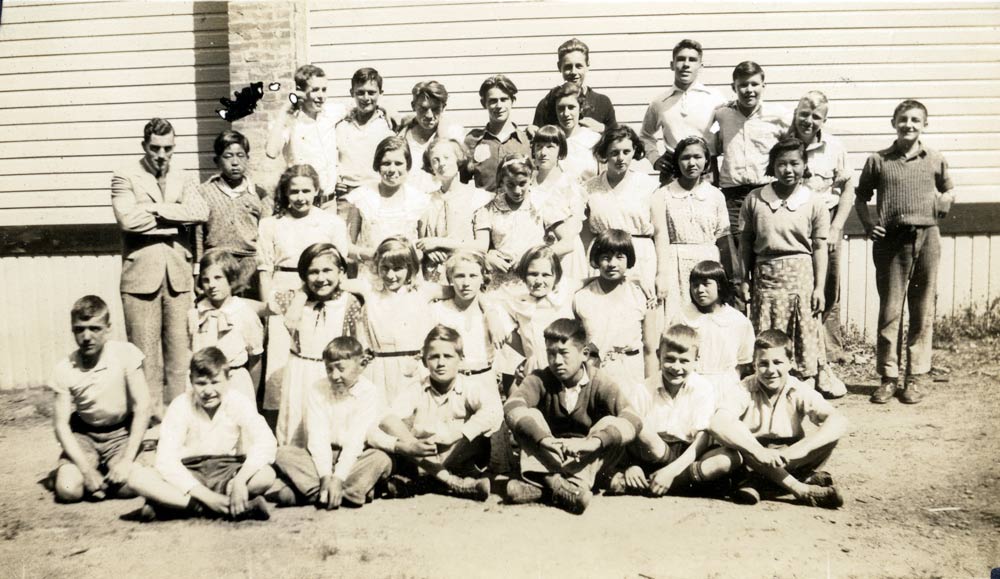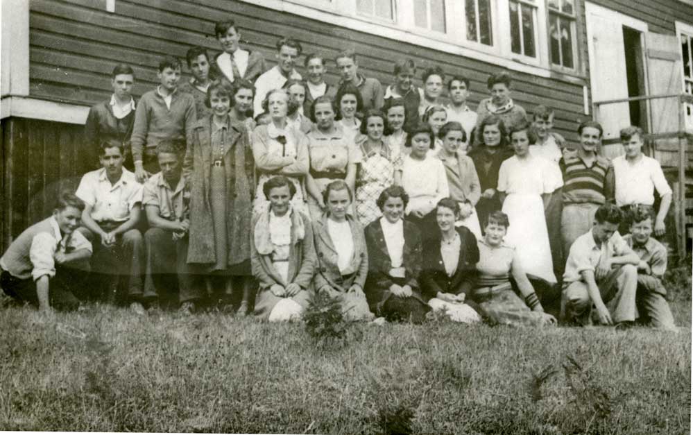 Ganges High School. Vernon Drake standing back 4th from left (highest head in the photo); Bruce Drake standing 2nd from left, with his hand on Ivan Mouat’s shoulder (sitting on bench far left); Colvin Drake crouching on far left; Dorothy Mouat standing with arms crossed, 2nd girl from left.