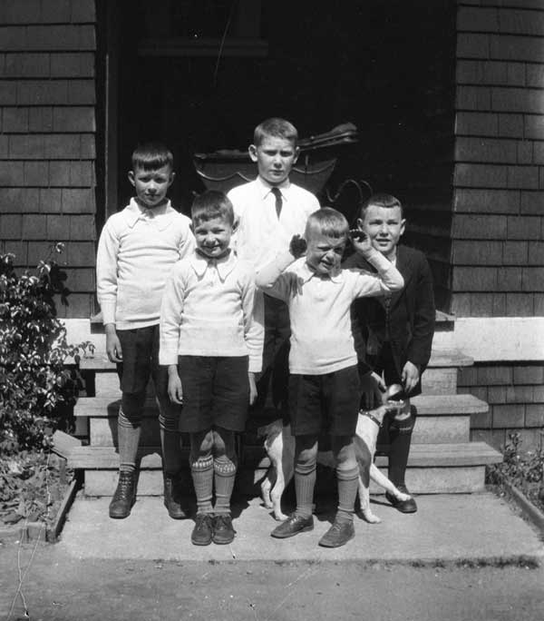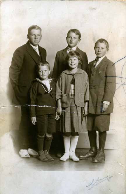 The five older children of Gilbert James Mouat (1886-1946) and his wife Martha Isabelle “Belle” (Nightingale) Mouat. Back: Laurie (1908-1979), Bill (1910-2004) and Colin (1911-1987). Front: Mac (1917-1999) and Jean (1914-1989).