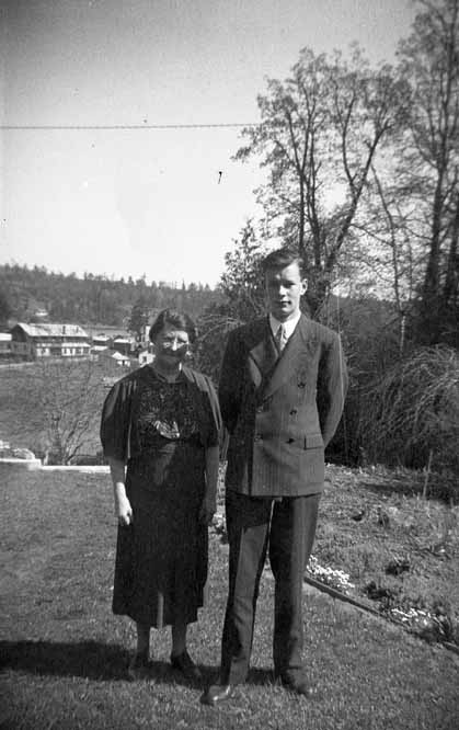 Colvin Drake with family housekeeper Miss Bessie Molyneux in the Drake yard.