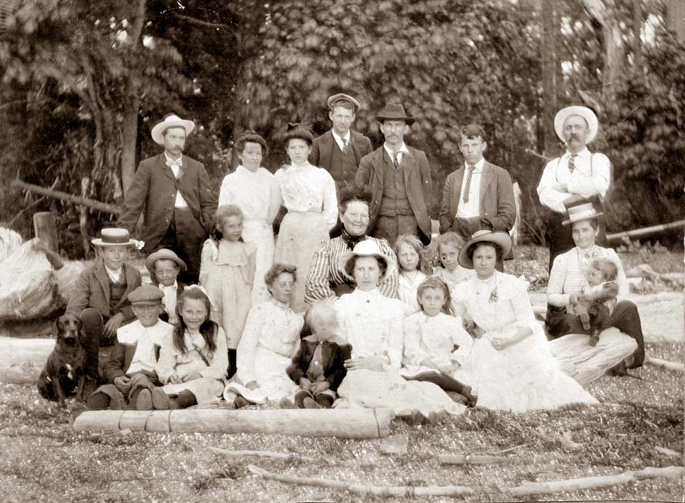 Standing from left: Norman Mouat, Tom Toynbee, Anne (Allan) Mouat, Laurie Mouat, Belle (Nightingale) Mouat, Jessie (Mouat) Toynbee, Will Mouat, Mary (Mouat) Wood, Clinton Wood, Betty (Morrison) Mouat, Arthur Drake, Torrie (Robson) Mouat, Gavin Mouat.