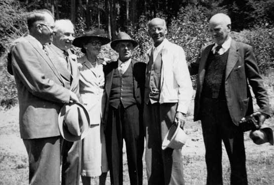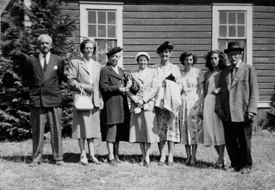 “Former pupils at 66-year old Beaver Point School are shown with visiting dignitaries and old timers. Right to left, Alfred Ruckle, one member of school’s first class, Ernest Harrison, Salt Spring’s oldest native son, Lionel Beddis, pupil of the 80s, Mrs. Lionel Beddis, Major General G.R. Pearkes, V.C., and J. B. Munroe.”