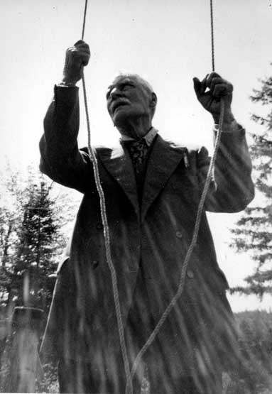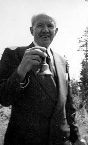 “K. C. Symons, headmaster of St. Michael’s Boys School, and former teacher at Beaver Point School, is shown with original bell used to call children in 1885.”
