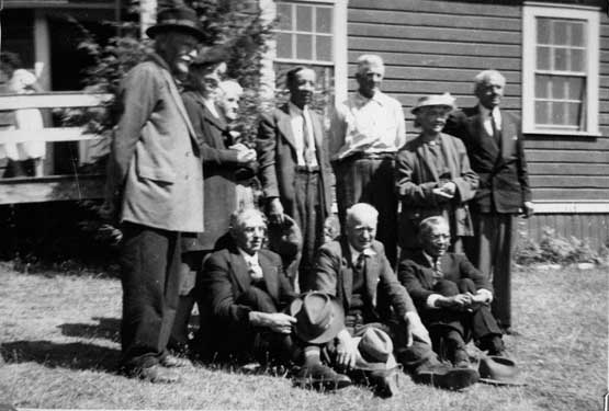 “Former pupils and teachers at 66-year old Beaver Point School are shown together at ceremonies yesterday at which it was officially written off the records as the oldest school in use in B. C. Left to right, back row, J. H. Monk, Mrs. Bertha Daykin, Miss Decie Beddis, Adolph Trage, Daniel ... Ruckle, Mrs. Clara Maxwell, K.C. Symons; seated front, Lionel Beddis, Alfred Ruckle, Leon King.”