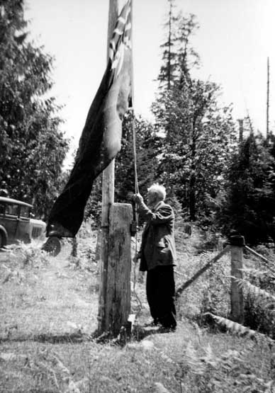 “J. H. Monk, former Beaver Point teacher, is shown lowering the flag at ceremonies which saw school officially closed.”