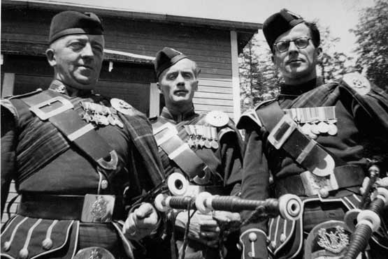 left to right are pipe major Andrew Pollock, Sargeant A.G. Allmutt and player D.C. Leask, all of Canadian Scottish Regiment.”