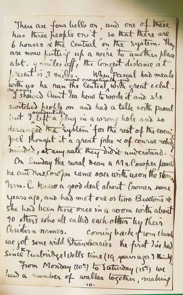 There are four bells on, and one of these has three people on it, so that there are 6 houses & the Central on the system. They are now putting up a wire to another place abt. 9 miles off; the longest distance at present is 3 miles. When Pascal had meals with us he ran the Central most energetically and with great éclat. One evening I shewed Aunt Isa how to work it and she switched people on and had a talk with Pascal but I accidentally left a plug in a wrong hole and so deranged the ‘system’ for the rest of the evening. Joel thought it a great joke & of course nobody minded, at any rate they didn’t understand.