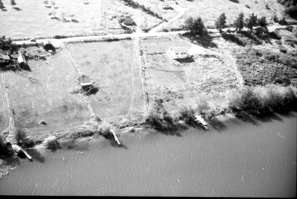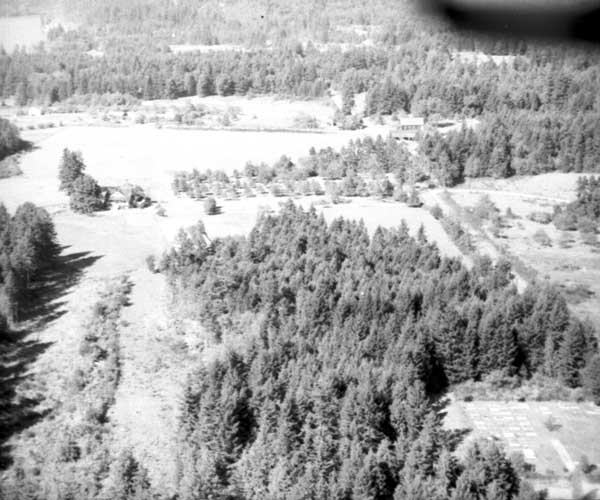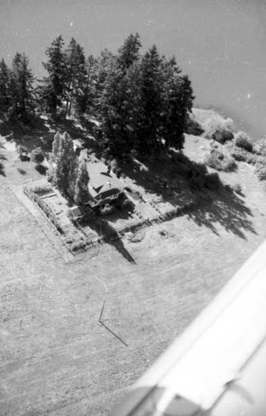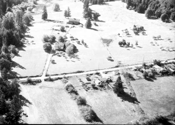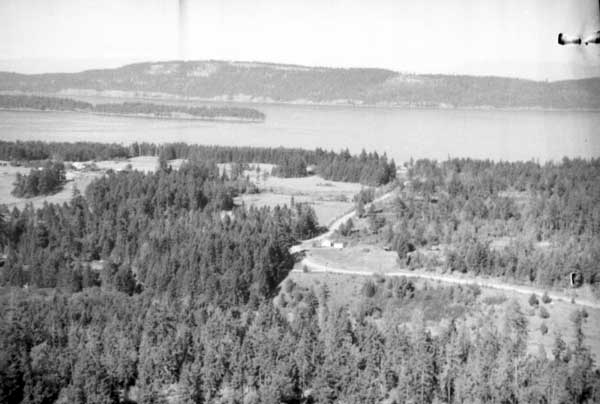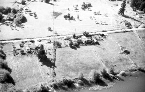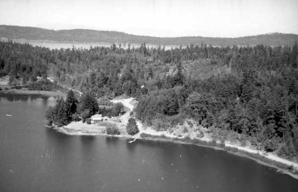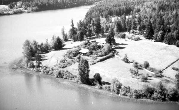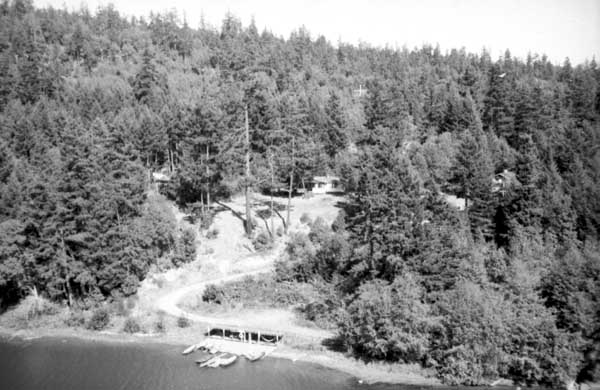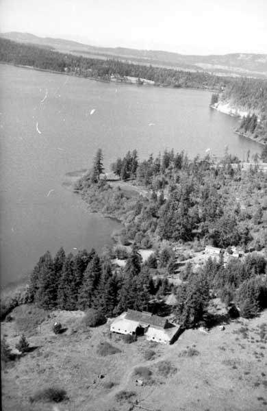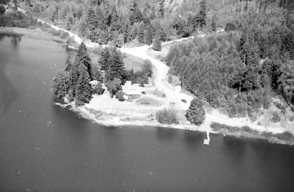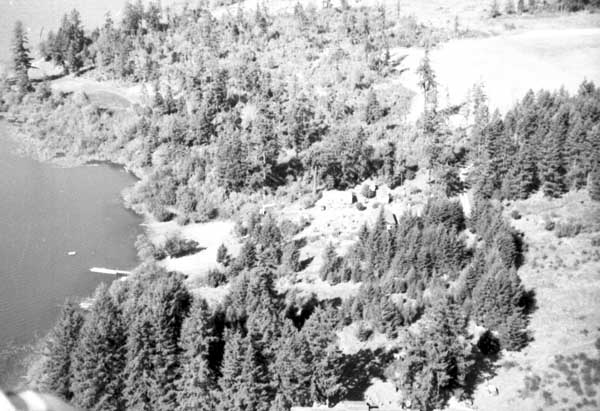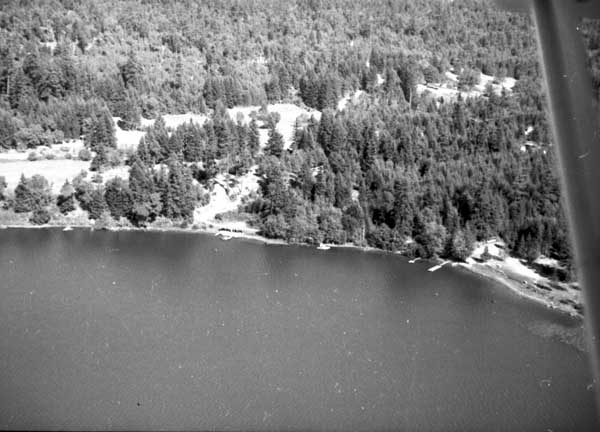 Resort at 1136 North End Road (currently Cedar Beach Resort) on the right. Resort at 1170 North End Road (currently St. Mary Lake Resort) and its boathouse in the centre