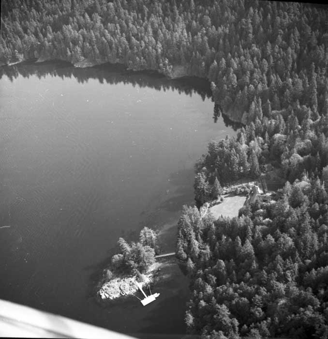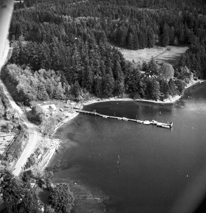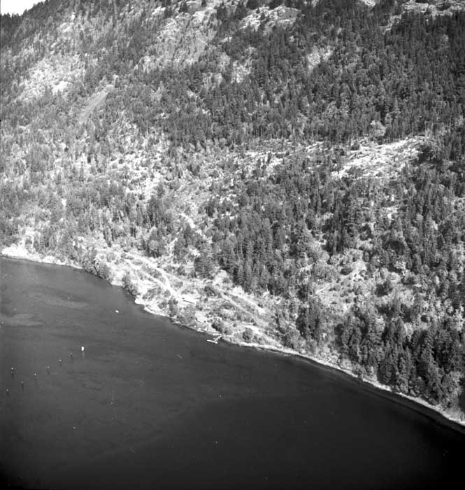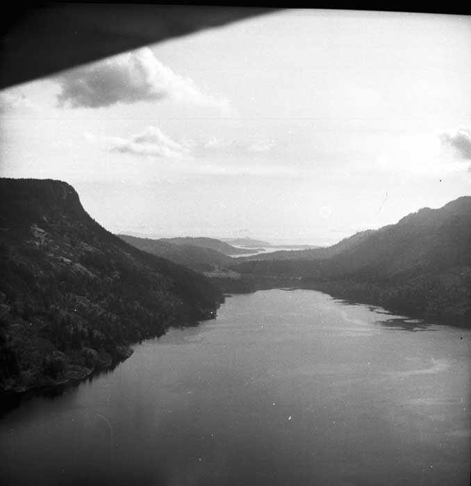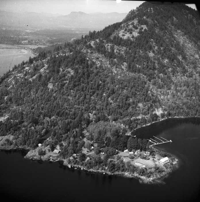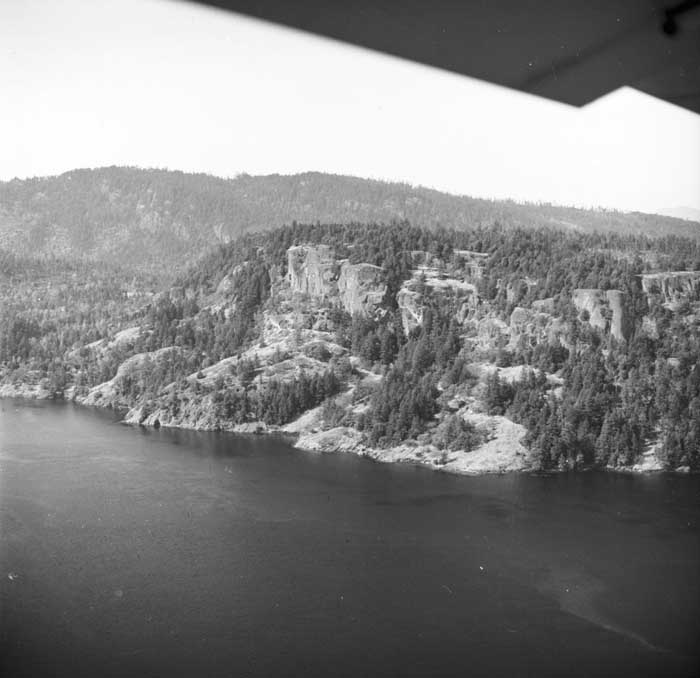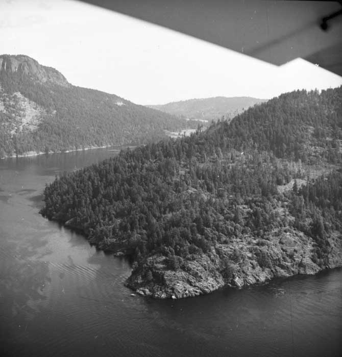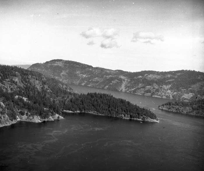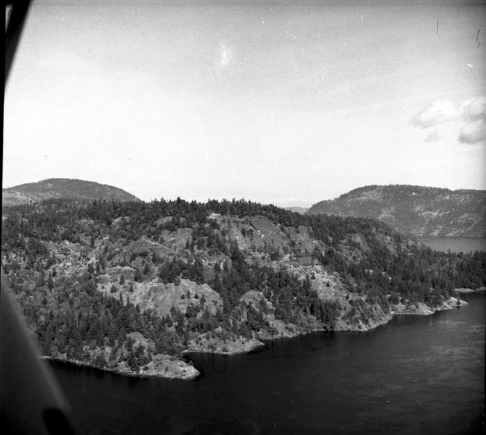 Bold Bluff at entrance to Burgoyne Bay from Sansum Narrows (Vancouver Island bottom left), Mount Maxwell top right
