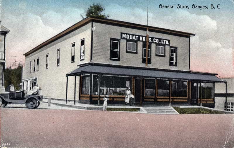 Mouat Bros. Co. Ltd. store, Ganges, tinted postcard, circa 1920s.