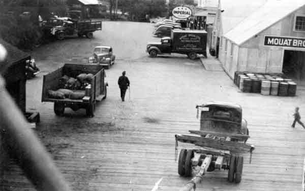 Ganges dock, Mouat Bros. Trading Co. storehouse,circa 1950. Imperial gas station