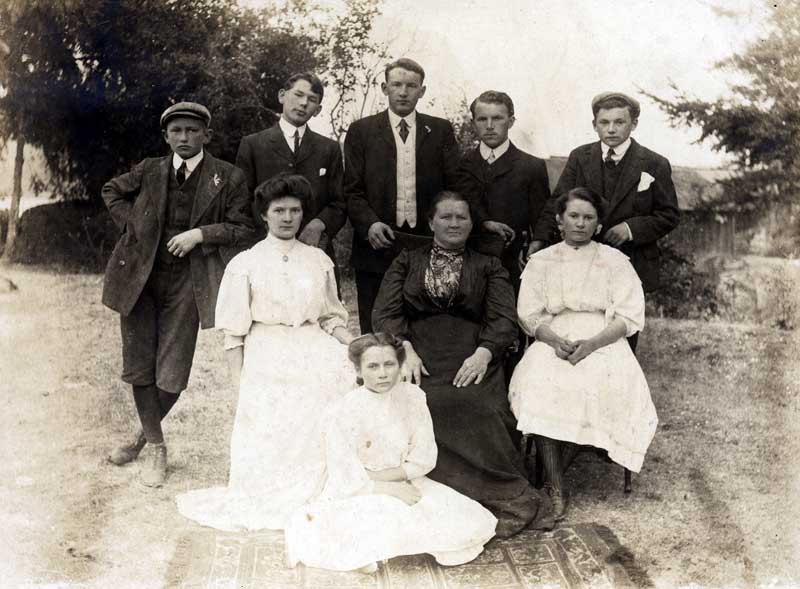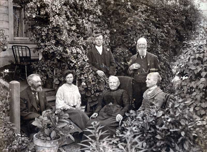 Bill McAFee (standing far right),“Aunt Barbara, Aunt Barbara (two young women standing) Gilbert and W.M. Mouat standing, (standing,too), Malcolm and Purvis famlies also.1907?