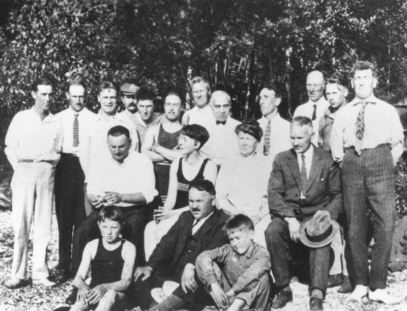 Mouat Brothers Picnic,1926.Rear: Tom Leversitch, Alan Cartwright, Ken Buttersfield,Jesse Wagg, Gerald Ringwood, Gerald Ringwood, Arthur Meacock, Bill Page, Walter Norton, Oliver Stacey, Arthur Elliot, Laurie Mouat, and Herbert Kingdom. Centre: Gavin Mouat, Miss Zasa Rogers, Miss Margaret Newson, and Will Mouat. Front: Colin Mouat, Gilbert Mouat, and Oliver Mouat.