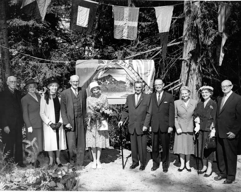 Mouat Park Dedication and Official opening, September , 1961. Tom Mouat, Olive Mouat, Effie Mouat, W.M Mouat, Torrie Mouat, Gavin Mouat, Earle Westwood(MLA), Jessie Toynbee, Mary Wood, Clinton Wood.