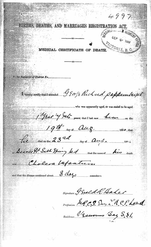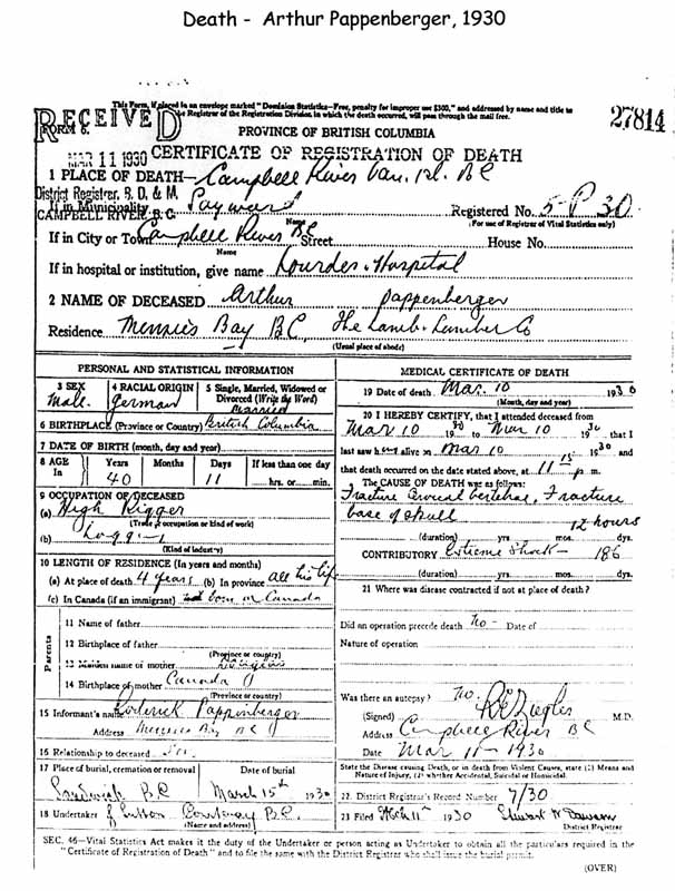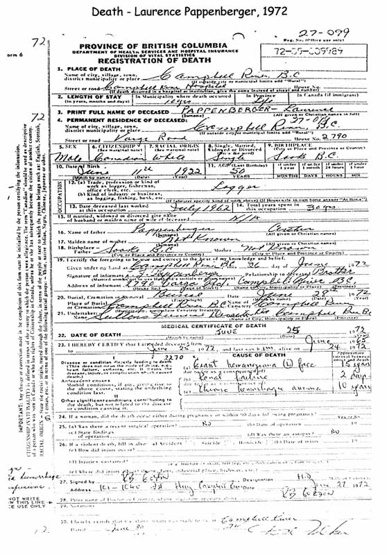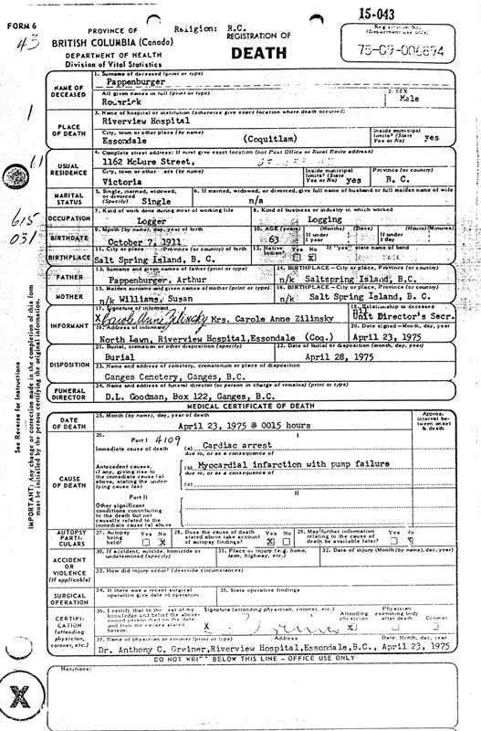 Roderick Pappenberger Death Certificate, 23 April 1975