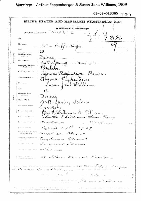 Arthur Pappenberger - Susan Jane Williams Marriage Certificate, 1909