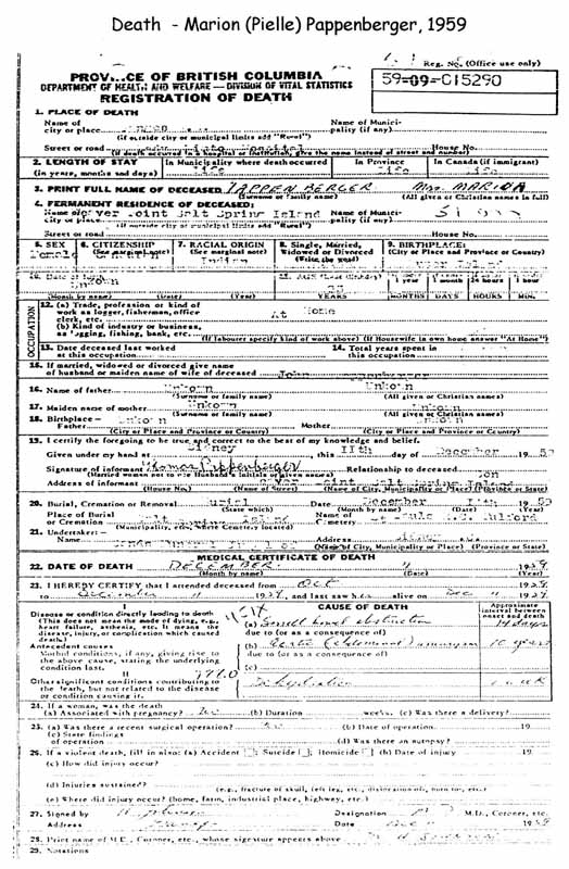 Marion (Pielle) Pappenberger Death Certificate, 1959