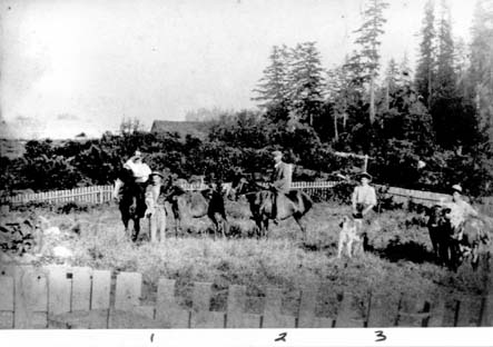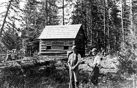 Charles and John Tolson (with rifles) built this cabin for EM Phillips c.1890, and their younger brother Leonard Tolson stayed there when he first came to Salt Spring Island. Phillips was a watercolour painter and author of a 1902 booklet about Salt Spring Island.