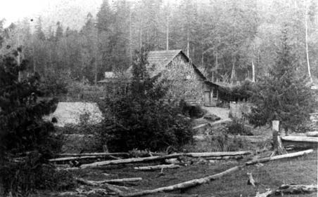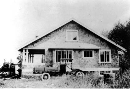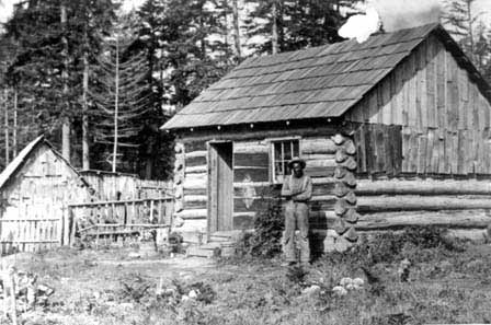 Willis Stark stands beside the house built by his father on the land pre-empted by the family. Willis was two years old when he arrived on the Island in 1860 with his parents and grandparents.