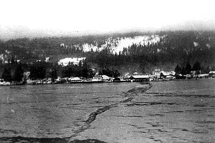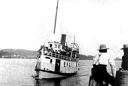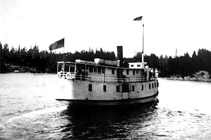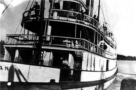 SS Island Princess disabled and being towed out of Beaver Point dock by SS Princess Victoria or into Beaver Point for engine repairs, depending on who told the story