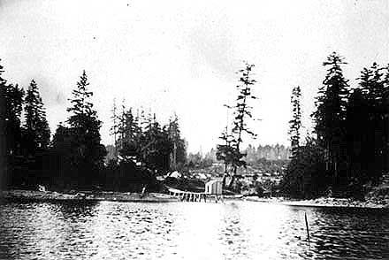 Very early. Bridge from St Paul's Roman Catholic Church to junction of Fulford-Ganges Road and Isabella Point Road. Fulford Creek in foreground