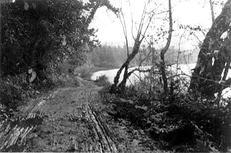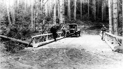 A bridge built across Cusheon Creek with members of the construction crew: Dick Maxwell, Cliff Wakelin, Ted Akerman