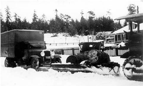Salt Spring’s first snow plough parked at Fulford behind the Island Freight truck. The building is Cudmore's store, which later became Nan's Coffee Bar, Kingfisher, Rodrigiz, etc