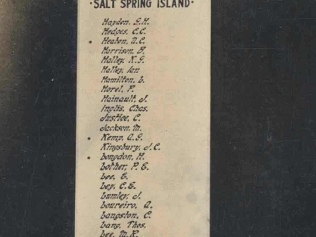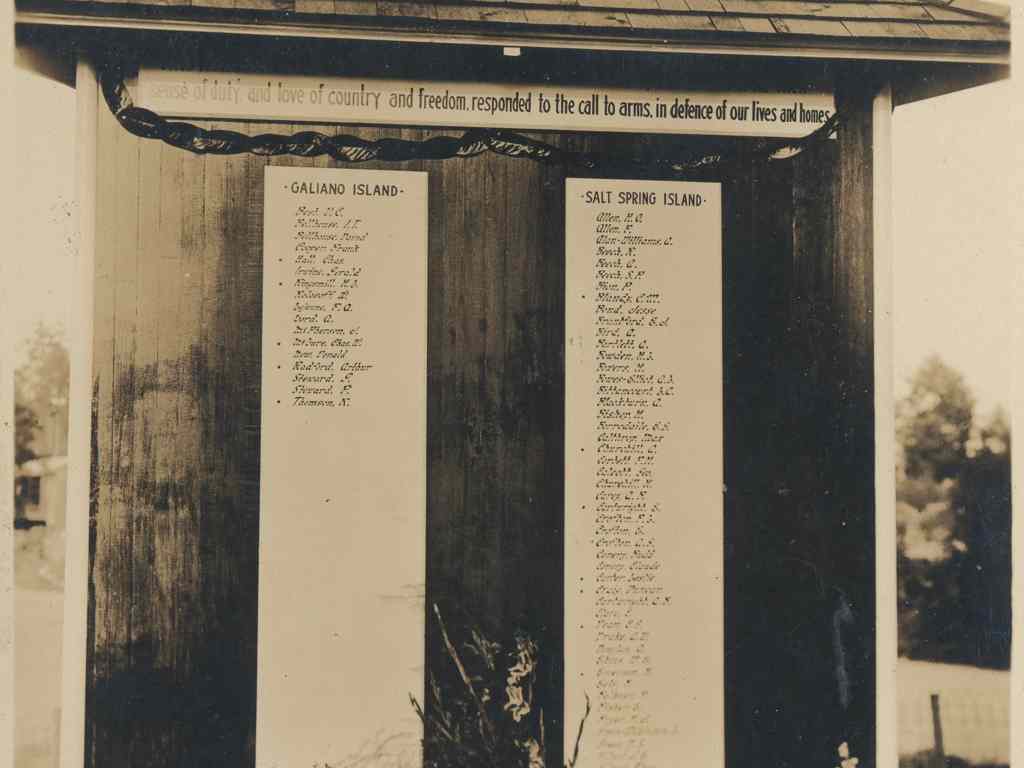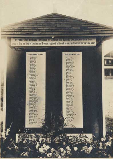 The Cenotaph was dedicated on April 17, 1922. The Galiano, Mayne, Pender and Saturna wooden plaques from the Honour Roll were sent to the various islands and the Salt Spring Island plaque was installed in the Mahon Hall where it remained for years.