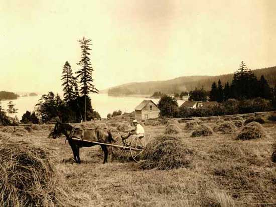 Mr. Crofton discusses his grandfather Fred’s early life in Ireland, and his 1899 arrival on Salt Spring Island, where he began early employment as an apprentice at Scovell Farm. In 1903, he married Nona Wilson, a daughter of the Reverend Wilson. Fred purchased Harbour House and developed a dairy farm. When World War I arrived, a number of young men went overseas, including Fred Crofton, who returned in 1919. While he was gone, his wife Nona cared for the children, kept the farm going, and began a boarding house. After the war, Harbour House was established as a country hotel.