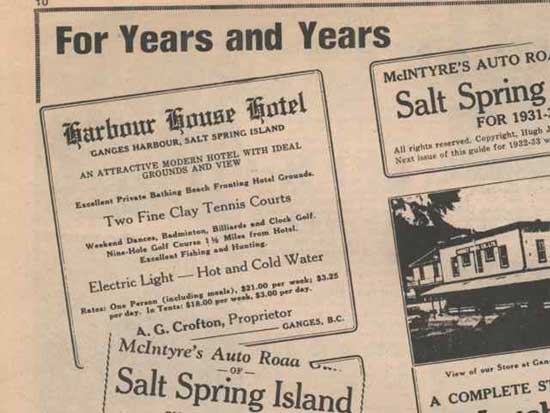 Mr. Khrushchev used to come. My father used to curse Mr. Khrushchev. My father was an excellent player in his own right, and, in fact, was the best player on the island and would usually end up meeting Mr. Khrushchev in the semifinals and had to play this clever wily American. But my father had a bit of a handicap, he ran the beer parlor that I will talk about in a minute, probably gonna finish at half past midnight. And then at 6am, you'd have to get up and prepare the courts for play. And he would put down the rock salt and spread some water on it to get it damp and have a quick breakfast by which time the courts dry, just enough to put this big, heavy roller on it. So you'd have to roll both courts twice, with a great big heavy roller that weighed about 500 and something pounds. And so by the time you've done that, would be just nine o'clock, he does the tapes and the just the that tournament starting in about half past nine, he'd be back on the court having to play Mr. Khrushchev. He just said in all those years that had happened, he just wished once said Mr. Khrushchev had had to get up and prepare the damn courts, and he could give a lollygag over breakfast, but that didn't happen. But the courts, you know, were really a central part of, of the hotel life once it was up and doing. The dairy herd was phased out at this point, but three milking cows were kept throughout the life of the hotel. unpasteurized milk but nobody bothered about it. In those days. It was fresh every day. Very large market garden. The crib sheet pigs, chickens and all the other good things. People who came to stay that's harbor house looking from where Hastings houses chosen the completed model. I think we've got to do we have one there that add? There is that's harbor house back when and you can see the prices, you know, $20 one dollars a week. You know, not bad. You know, back in the 1920s people when they came in those days people didn't have cars. They didn't go all that far afield if they were taking a holiday. They needed something that was reasonably modest. People would come to harbor house and the Princess Mary from Vancouver. People who worked in shops and did all sorts of other things come and stay for a week or two weeks as the case may be. But they came as foot passengers in a hotel car would meet them at the village, bring them to the hotel and so the hotel really hard to provide them with all our entertainment and this was the days before television and all the other good things so we had to find alternate means of entertaining them. oysters and clams are easy to find anywhere. So the summer lots of beach parties. Fishing was was good. Didn't tennis. Golf was not that far away. Card games. singalongs dances, one of the great hoots that they always had were scavenger hunts. I don't know whether you've ever been on a scavenger hunt. But boy, that's something else. They used to drop lists of ridiculous things like an ant or a frog or, or a bird's nest or a bull rush or something. And they'd be divided into teams and each one put in a car and you didn't start until darn near dark. So finding bird's nest in the dark we have all these tricky things. And off they go racketing around the island to try and round up all the things of the scavenger hunt. There was a price for the first car back I remember coming through Ganges and the drag rage side by side with my aunt. Luckily there nobody else on the roads in those days. And once they were back then this skid would have to be performed. And each team had to put on the skip and that was was huge fun ever in the island GOTTA GET TO KNOW THAT WAS scavenger hunts are on with the noise and racket and honking horns and goodness knows what the older guests of course, didn't feel up to that they used to wait until we came back and then they would laugh and the hysterics of the things were put on but this was a I'm talking about this as the the nature of the hotel and the way the family ran it. Guests were friends. And we entertained them. If they wanted to go fishing, we took them fishing if they wanted to go to go play golf, if we didn't drive them there, we might even stay long play along with him or tennis make up a fourfold these things. As family members growing up as part of his clan there was always a job in the summer. In fact, you impossible to avoid going and doing your shift at something washing dishes or cutting the grass or my father was very glad when I got old enough to get on that dirt and more roller for the tennis courts. Families came back year after year after year. When the place was developed. It had 18 rooms in the hotel proper. And it had six tenths of the original tents were the wooden platforms were built on the canvas was put up in the summer and taken down for the winter. And they were eventually replaced one by one by proper cabins. So it wasn't a large establishment, but it was always chock a block full in the summer. And people wouldn't be farmed out to the acklins or somewhere else when you get an overflow it was if you came to the island without a reservation you be in big trouble to find somewhere to lay your head. Most people booked ahead and that was sort of solved the problems. The hotel was run the the mainstay of the hotel was the cook, Billy ng a Chinese fellow who came in 1924. And he liked that so much he they kept him and for the next 40 years he was the family cook. He was an absolute Marvel. He was tireless. He worked seven days a week in the summertime. He was beloved by the guests his his cooking was he did marvelous soups, wonderful desserts, fresh produce on the plate every day, plenty of it. And whenever they came, the first thing they did when they checked in they had to go and say hello to Billy and they say Billy is still here. They were quite anxious to make sure that Billy was still a cook because of his father holiday there wasn't. Billy didn't like people in his kitchen. They weren't allowed to stay very 