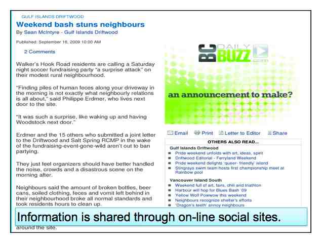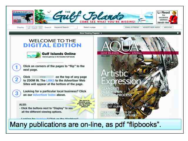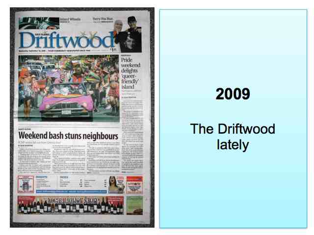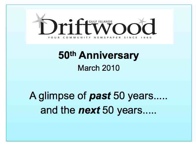 For people who want to read things online, but aren't crazy about the busyness of websites, and the blinking and talking, and the singing and whatever, we have now something called a flipbook. You're probably familiar with PDF format, which is a pretty universal format. Now, we were putting magazines like Aqua magazine online, and they're really easy to use, you just go to the address, and up in the top right hand corner, you click it, and it turns the page, just like you're sitting at the kitchen table. And it even makes a little noise with the page turning. You can print the page, you can send the link to, you know, your son in Calgary, or whatever the case is. So that's, that's part of the the technology that I really enjoy. It is getting back to what the print product is like, even though it's online. If you have grandchildren, you probably heard of Facebook. You may have even used Twitter. Does anybody know what Twitter is? Besides Jamie? No. Okay. Well, these are all social media platforms, which allow people to get information very quickly. If you were on our website, for instance, and you were looking at the story about the weekend soccer party, you could go up here to share or email, you could go up and click the Share or the email. And we'll give you a very options of how to send that to somebody else. And that's how information moves around the globe. So fast now. If you can find your way around the website page, you can send anything anywhere. Our classifieds are online. People put an ad on in the driftwood they get to read online at BC classified.com. Go finance driftwood.com. And that's necessary for us. As you know, we have to compete with some of the free sites like Kijiji and Craigslist and this type of thing. Now you're able to buy your photos online. If you don't want to come in to the driftwood and say, I'd like that picture from last week's front page to send to my grandson. You can go online, click the photo, put your credit card in, and it'll be mailed to your house in a week. That's what technology does for you. So coming up, march 26, which is a Friday, we're going to be celebrating our 50th anniversary publishing the driftwood. So there'll be an event at artspring at the galleries that day, which you're all invited to. It'll start at 10 and five, we've invited a number of community groups and businesses as you know, historical society to be part of that. The library will be part of that we have mullets. Patterson's, the Saltspring in the latest incarnation of the in whatever rate, there's a total of nine community partners which will be there displaying some of their materials from years gone by, and will have, as you see pages around the outside of the wall here, we'll have about 35 of those blown up the poster size, you can spend a few minutes and read some very interesting articles on the sewer by lobbying past. For those of you who are here for that, it's made good reading, I'll tell you. And there's a number of faces, you'll recognize places you recognize eventual recognize. And so we want to make it fun. Want you to spend a little time there and enjoy yourself, we're gonna have a little fun with a two. We're offering some cash prizes for those of you who are the best dressed driftwood readers. If you I don't know if you've seen the paper yet today, but I'm, I've got a picture in there with my driftwood kill time. So for those of you who'd like to make a hat or a purse or whatever it might be and bring it with you. We're going to give away $50 prize to the five best dressed driftwood readers. So we will have a little fun with it as well. So, before I take any questions I'd like to ask Dorothy and Duncan, if you could give us a quick highlight of your time with the draft. Just give me your