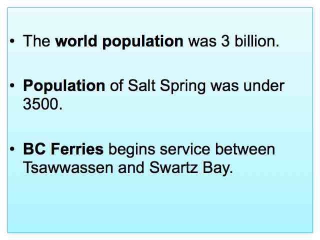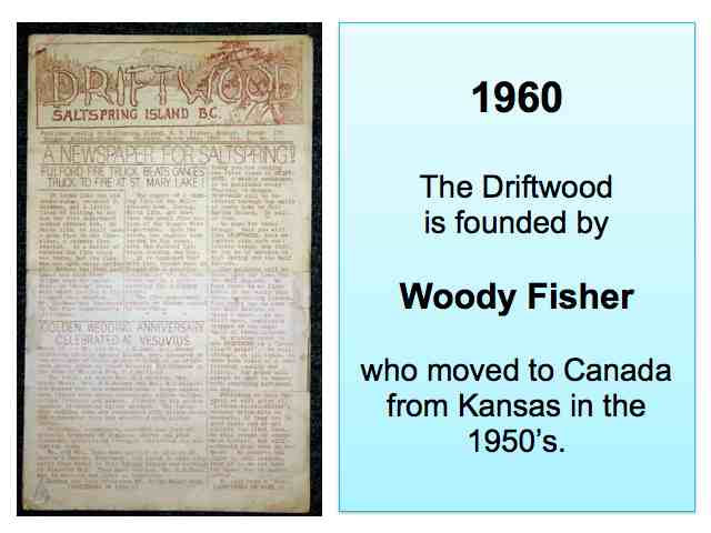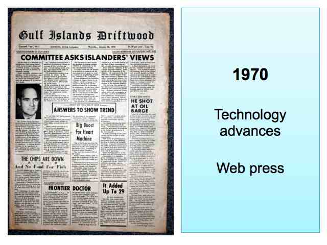 afternoon, everyone. The subject of my talk today will be as much about where the driftwood is going as where it has been 50 years, a glimpse of the last 50 years and I look ahead to the next few years, the way things are changing. I'm not sure we could jump ahead too far. But Frank, give us a slide. So I thought what we should do first is kind of get our head around what was happening in the world and unsolved spring, when the driftwood started publishing. 1960 was the year John F. Kennedy was elected president and he had a son, JFK Jr. Hawaii was lashed to join the union and cashes clay, who later threw his gold medal in the river was given a gold medal in boxing at the Olympics. Was that in Munich? I can't remember. I was to Diefenbaker was Prime Minister of Canada. This is an interesting one. WAC Bennett was re elected premier of BC for his fourth term. He had won 32 of the 53 seats in the legislature. And I think you'll agree that as BC politics goes the last 20 or 30 years, I seriously doubt if anybody will ever go for terms again. Joey Smallwood was I heard that Joey Smallwood was premier of Newfoundland, and of course, they were the last province to join Confederation. The world was relatively small, were 30 billion now 3 billion in 1960. The popular population of Saltspring Island was under 3500. And marking their 50th anniversary with the driftwood is BC Ferries they began service between to Austin and Swartz Bay, same year. This is the very first issue of the driftwood which is blown up and put on a hardcopy there in the walls you can take a peek at it was founded by a fella by the name of woody Fisher who moved to Canada from Kansas in the 1950s. He he ran the driftwood with his brother, but there doesn't seem to be much said about his brother for some reason or another. Just for a second Frank will go back to that other one. I wanted to mention what the front page story was. In case you can't see it from where you are. The Fulford fire truck had beaten the Ganges truck to a fire at St. Mary's Lake. As you read it up here, you'll understand that both fire trucks were in Ganges at the time. And it just happened that the Fulford fire truck was in a better position. When the bell went to get out to St. Mary's lakes and the Ganges truck. The Duke celebrated their 50th wedding anniversary in Vesuvius. It's well known Saltspring name, of course. Hit me. This is what they printed the barefoot on. Many of you would be familiar with the stettner press. Especially if you had anything to do with the educational system. In the early years. This particular one was was hand operated actually see there's a handle down here who would crank this thing up, and it would print eight and a half by 14 sheets of paper, printed one two sides. And the driftwood at that time was 10 pages. So I'm really not sure who this young guy is. Are you do you have any idea Duncan? No, no, it's not me. It's Duncan worked at the driftwood in the early days. And we'll get you to give us your favorite favorite recollection at some point. How's that, along with