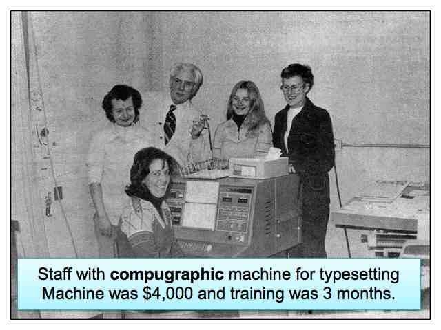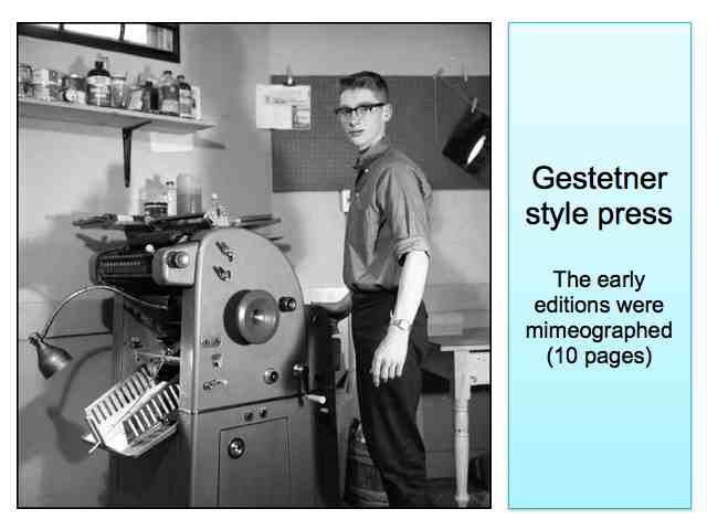 Peter is talking about the past of the Driftwood, explaining “how we did it then” when the paper started in 1960, the paper’s ownership and management in the early years, the staff who created the paper—including old staff photos—and the equipment they used. A slide show is incorporated into the presentation.