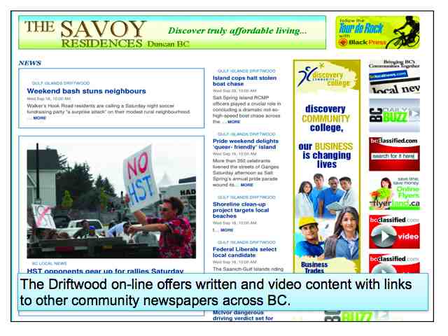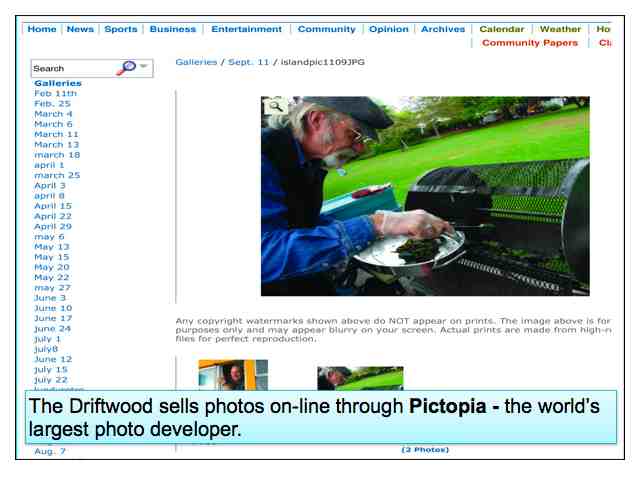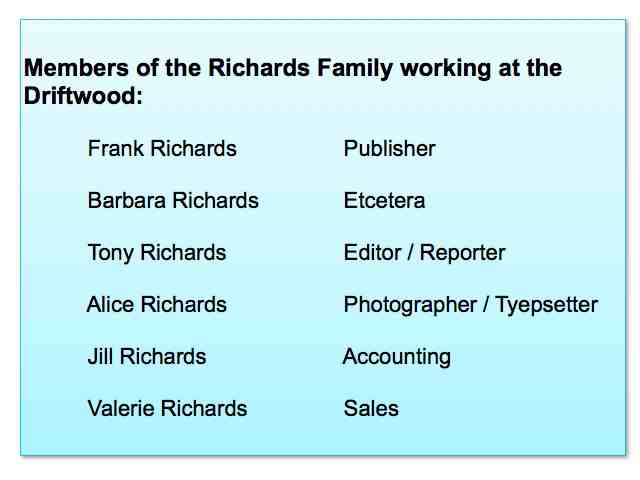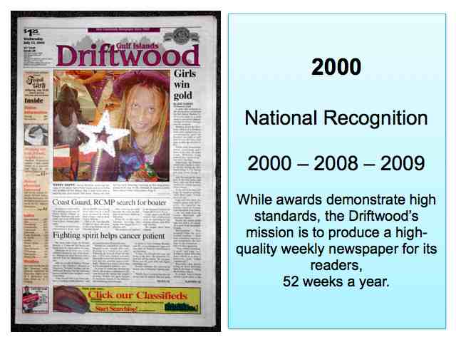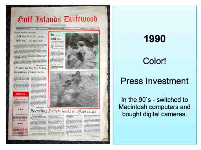 So 1980 Things changed for the record a little bit, not only in the way that the paper was being produced, but the way the newspaper Well, the Richard's family started take a bigger part in the newspaper in the BC why and the CCNA. Those are the provincial and national organizations. So that brought national recognition to the paper because we ran very high editorial standards. In 1983, the paper placed first in Canada and its circulation size. And this was the staff at the time. Catherine McFadden was the office manager for just over 20 years. And you'll see there's Barbara Frank Allison Tonio Fred. In 1990, there was another press built on Vancouver Island was built in lady Smith by black press. And it marked the start of a whole new era in publishing. It allowed us to put a little color on the front page. This wasn't a process color photo as you're used to now, but we were able to put red on or blue or any one of the solid colors that we could get the next year or two after that it was started to appear as process color. We also the driftwood started switching to computers at that time and bought digital cameras in the 90s. I came to the driftwood in 1998 and the next year we bought this camera. It's a Fuji color camera was one of the very first digital cameras around and we bought it used for $2,500 and it took 11 pictures. That's all and up until then we were running 35 millimeter cameras rolling our own filming a little dark room. And you could go in there on Sunday when Derek was done running around town And then that would be all probably two to 300 photos hanging in long strips. And he had the bass and you know, so you could do all the prints and everything that we would scan those or make a PMT is it's called a photographic and wax it right onto the page, those would be all sent to the press that way, and they would make negative. So as we get a little older, the drift would get a little better. As the community started to grow, I like to think the Deerfoot is simply a reflection of the input of the readers. Because basically, if it wasn't for the community, there wouldn't be a newspaper. And this is one of the most active communities I've ever seen that participate in their local newspaper. In 2000 2008 2009, we were lucky enough to be named first place in Canada and our circulation sighs. And we always like to say, you know, wildly awards demonstrate the high standards. Our mission is just every week to put your nose down and create a newspaper. And at the end of the year, you have 52, but we just look each week, one at a time. And it's combination. 52 weeks is what you get. The driftwood is only had seven publishers in its 50 year history, which is quite remarkable in itself. What do you Fisher and Jim Ward, which were the originals for seven years, Frank Richards, Tony Richards, Tony went to work for the CCNA, which is the Canadian Newspaper Association at one point in the very early 90s. Actually, I think was the very late 80s into the very early 90s. And went to Ottawa to help them run their program which sees, then trade, trade is not the word I want. It's an exchange program for newspapers. They'll take a person from Africa and put them into Japan. And they'll learn how each other does their thing. And it spreads the word gets people reading and printing better newspapers. So anyway, Tony, disappeared for three years to Ottawa, and hired Joyce Carlson to run the paper for him in his absence. And when he returned, she went to Powell River and started to paper, which has done very, very well. And she's gone on to be president of the BC y and the CCNA. At another time. Penny Sakamoto took over from Tony, both five or six years ago. And now she's running the Victoria news for the black press group in Victoria. And I was sales manager at the time, and had some good experience. So I applied for the job, and was lucky enough to get it. I'm the only one of the seven people who has an immediate experience outside of the newspaper industry, which is kind of where everything is heading. And the next part of our talk is going. So this is this is how the driftwood looks now as opposed to how it looked in 1960. We have full color on the front, you can see that there's various elements which are intended to draw you into the paper, give you an idea of what the story is about on the main page. keyframe. So where are we all headed now that we've kind of looked back at the at the history of the driftwood very briefly. And that's really wherever technology takes us college grads today when they go into school, one in five. One of the I guess the jobs that they're applying for one of the five, the jobs hadn't even been thought up yet. I don't know how they get their head around that. Because when I went to school, you know you went in and you had a pretty good idea of what you're going to do in four years when you get out for seven years or six years. Today, jobs are evolving so quickly. They could be applying for something that hadn't even been invented when they get out of school. And that's where the technology is taking us. So the driftwood is online. Now, as you might imagine, most newspapers are online. Most of the content that you get in the newspaper each and every week is online. We have the written we also have the photos, which are all linked to other community newspapers in British Columbia. But we also now have video as well. I'm sure you've all seen these little video cameras you can buy now they're about this big. We now have the ability to run down to the harbor and take a picture, some short video or take your video if you have something happening and have it live on the internet. In a matter of you know half an hour very quickly if there's something important happen And it shouldn't wait until Wednesday, we can get it on the internet.