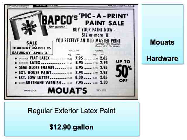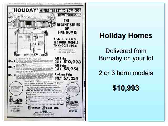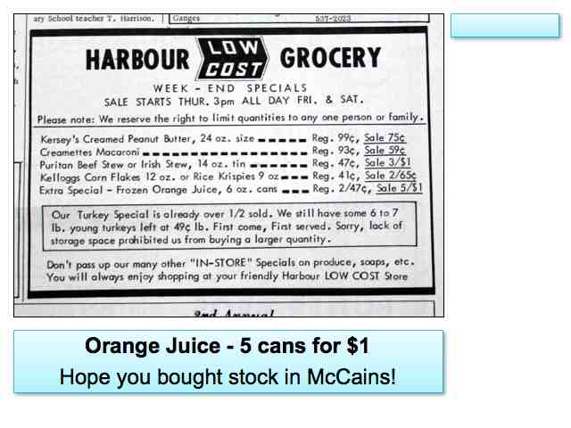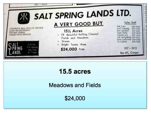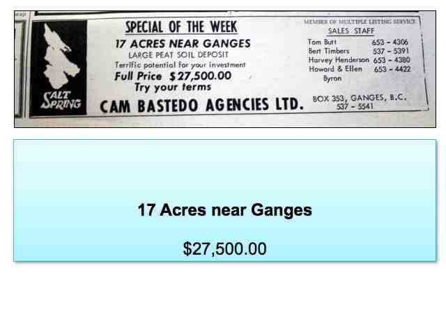 cedar beach resort was more of a resort at that time. It's more now for camping, of course. But they were offering a New Year's Eve party for $12.50 a person at their Polynesian room for New Year's Eve in 1970. The harbor low cost grocery. I looked through this a couple of times and I was looking at the prices and the one that really stood out to me was orange juice five cans for $1. So if you had stocked in McCain's in 1970 and they sell it now for $1.79 account or something Thank you probably would have done pretty well. This is a really good one holiday homes and Burnaby would deliver to your life. Of course at that time Ganges and Saltspring I should say was growing and so as the Gulf Islands with vacationers from the Lower Mainland. You could get built complete on your lot. Three bedroom house, two or three bedroom models to choose from. For $10,993 delivered from Burnaby to Salt Spring. If you wanted to put it together yourself. It was $7,254 I'm not sure what you get for $7,254 today but it might pay for half the windows. Mo it's been where was very popular. For those of you who have a London mist raincoat hanging up in your closet, you'll know that it costs way more than 2495 BC plaid shirts 795 or as we call them, well I'm from Nova Scotia we call them BC Terrington. mullets, of course was the hardware store. Regular exterior latex paint and in 1970 was $12.90 a gallon. So for those of you that, remember your paint prices, that's a pretty good price. Shell is older than the barefoot. It's been around. I'm not sure how long but it's been more than 50 years. At that time, it was run by the current hens. And they were leasing hot water tanks for $4 a month. Saltspring lands 15 and a half acres of fields and meadows with a stream and a bright sunny area for $24,000. And you'll see that in 1970. Mel topping was one of the agents and Bob Terra.