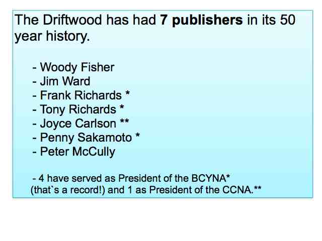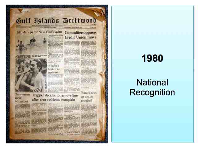 Thanks, Peter. That was pretty good. I guess, thinking back from the time there has been four or five newspapers on Saltspring. The driftwood has survived all of the all of the ones that have come and gone. So obviously, it does serve the needs of the community in a more positive way than some of the others did. But I guess we all look forward to reading the driftwood. And seeing if our name is in it or not hoping it isn't, but occasionally is there I would like to take a moment to invite you for coffee and tea. And to have a chance to look at the pictures and look at some of the drift ones that are out here that Peters mentioned, is probably more important that if you have a look at those driftwood, you'll get a very good indication of, of the stories of the past and sort of how the driftwood has evolved and how it does serve the community. And I've often thought that when I look at the driftwood, how the stories don't really change that much over the years, you can go back and see the same story in a different light or something comes up, changes at the sewer comes up every once in a while. And probably that'll be a big story in the next while if they tried to expand it again. Islands Trust has always been in there ever since they were incorporated and incorporation is always a story that keeps rolling back and forth. So you can go and read read some of that and find out that although the island population has changed, and the Griffin has changed, a lot of the news is virtually the same. And he didn't mention your Friday edition. But I like that I think that was a good good thing. Arthur blacks in the Friday edition, it's always worthwhile read that it's free, which is sort of nice. So thanks very much Peter enjoyed it very much.
