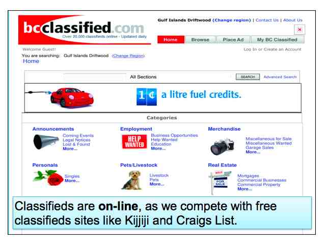 it's a very awkward spot right now in in media in general, there are very few websites, which would generate the same amount of revenue, as you could make from your print product. It's we've started here, we want to get here, but we're somewhere in here. And as a matter of fact, you know, over the last couple of years, revenues had been building towards advertisers who put their ads online as opposed to in other media, like television, radio newspaper, it started to move pretty good that way. And then the economy changed in the last 18 months. And there's actually been a slide backwards of people advertising online, they've gone back to more traditional media, because they found that that works for them right now. I'm sure that we'll get there. But I have no idea of when or how it's just going to take care of itself. The fact of the matter is, though, is that, you know, the revenue you can generate from printing a newspaper, and paying all the employees still is better than putting it on a website and having two people look after it in order for people or a reduced number of staff. And the models in the states are not much better. The New York Times Washington Post San Francisco. I think it was about three years ago, Washington, the Washington Post had 200 videographers working in their newsroom, as people who could either write a story for the newspaper, or take a little camera out and do a video report and put it on the internet. And write for the paper. And you know, that newsroom is now half of what it was. It just started in that direction. And I think between I think the economy had an awful lot to do with it. People just stopped spending money, and then they went back to what they were comfortable with. So it'll happen again. But I can't tell you when