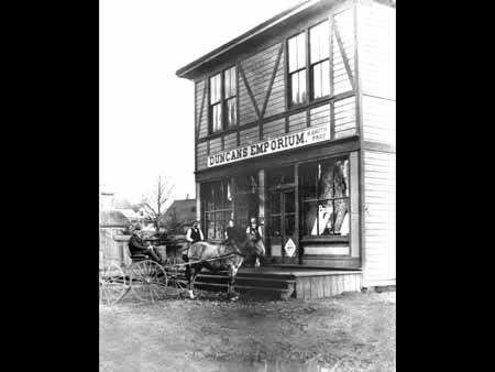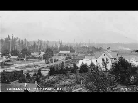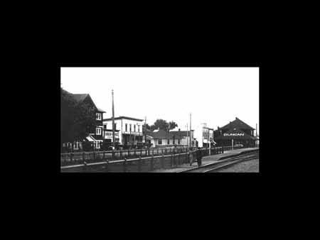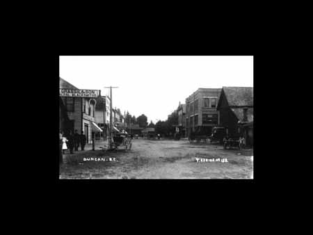 This is the station streets, looking east, one of the main streets in Duncan. And the the settlement really started in in well, actually, I guess it'd be the 1850s Excuse me, but in 1862 that Hacket a ship called the Hackett arrived in Cowichan Bay, and brought 78 men to the valley and the Sir James Douglas had created the preemption law. So land was available for $1 an acre. So these original 78 men were brought in, many of them looked around and saw the portunity and others just looked at the land that had to be cleared and turned away and said, No, thank you. But certainly that was where a lot of the original settlers came.