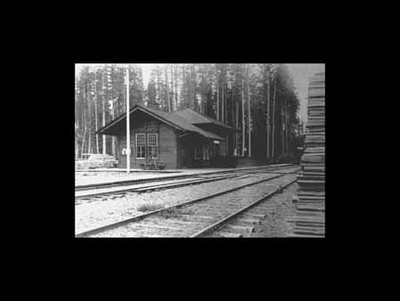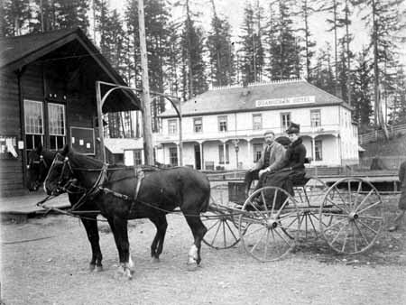 Did I do something wrong? Oh, I did. I did. I did. Okay, so it's this one, right. Okay, so this is the station that we're that we have the museum and now that is from 1912. But the original station was built in 1887. And it's VIQUA, you can see it's quite a bit smaller than than the other one. And the, it was not ever meant to be there. In 1886, there was the last spike ceremony and the what happened with William, William Chalmers Duncan had petitioned to have a station in this place. So there was a station in Cook silence amanotes, just north and south of the station. But the people of Duncan and were becoming determined that they wanted to have their own station. So what happened was the mr. Duncan went around to several into all his neighbors and to everywhere he could talk to anybody about having a station on his land, because actually the station was the the town site was built on on William Chalmers Duncan plan. And so on August 13 1886, when the Prime Minister Sir John A Macdonald, and Robert Dunn's me were coming through with their wives and other officials. The people of Duncan actually stopped the train. They had built a giant cedar arch, and they had the the children and the teachers from St. Albans, and the native people turned out the story is that there were something like 2000 people it's actually closer to hundreds of people rather than 2000. But they did petition Robert Dunn's near forestation and songs were sung and stories were told and one little girl jumped up and handed a bouquet of flowers to two, I believe it was McDonald's wife and it went on for a little while. And after that, Robert DUNS me said, okay, okay, boy, so you'll get your station. Now. There's something called Kitchen, kitchen table history, and the story is, is that it wasn't so much that they were impressed with all of those requests. It's more that McDonald's and Dunsmuir were very keen to get back to Dunn's Mears mines up in Nanaimo, because apparently Dunn's we had a wonderful store of liquors down there. And they were just really keen to get there. So I don't know if that's true or not. That's the story that's told. But in any case, Duncan definitely got it station. Okay. Okay, so this is, this is a photo of the old station still. And you can see the chromogen hotel in the background. And that is Florence Jane's and her uncle Percy Jane's in in the carriage there. And it's interesting. Well, I mean, you I'm sure anybody who is here loves history, but it is wonderful to see these old photographs and how the townsite originally looked, you know, seeing those large trees of course don't exist anymore. So it's a very interesting thing to see.