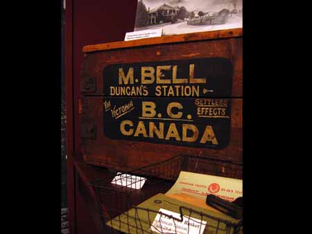 Okay, so in the museum, we do have a section that addresses early settlement. Now, this is actually a photo from the 1890s that shows, you know, the development of the area. And the slides that you're going to see that represent the tour of the museum, some of them are detailed, and some of them are larger shots of the various exhibits. And the mandate of the museum is to collect collect items and artifacts that represent European settlement in the Cowichan Valley. Okay, so the, this is our railway exhibit. This, this is a very nice thing to have. We have a lot of visitors who come in and they think it's we're a train station Museum, so they're really disappointed to see the things that we have sometimes. So it's nice to have a small display. And so the the gentleman the photograph of the gentleman you see there, that's his name is Roland Fossett. And he was the first station master in the 1912 building and he and his family lived upstairs in the train station. And that box that you see that's for medley Bell and that was a really common thing to see at these at the train station those those were often called the settlers effects of the boxes held the settlers effects.