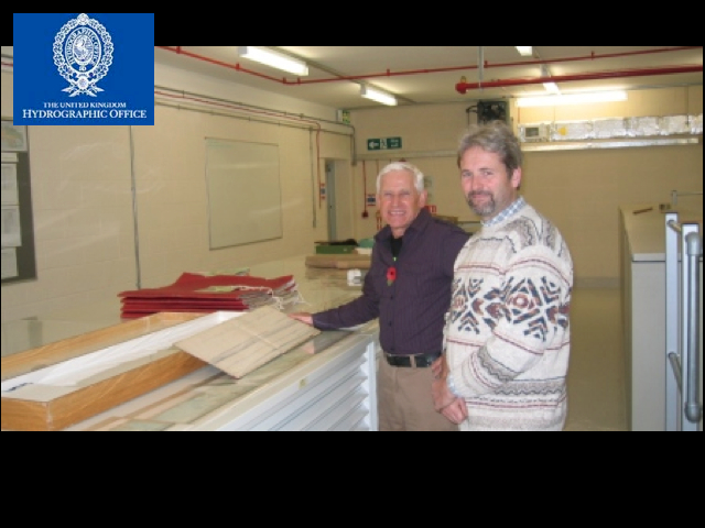 I'm just this is the cover of the journal. And it is not a book that we wrote is it is a reproduction of Captain Richards journal itself. So it is not our book we are the editors at his capture Richards book and I hope that over the course of the next hour or half, you will come to know a little bit more about Captain Richards a very important contributor to the colonial and in fact, the maritime history of Vancouver on the data of British Columbia. Just bear with me when I figure out where everything is this, the story of the journal began in 2006 for us when we made a Risha research trip to England. And we were working on behalf of three First Nations of Vancouver Island, just given sort of carte blanche to look around and see if we could find any documents that were held in, in England. And so we went to the called it's called the TNA now, which is the other National Archives. It used to be the Public Records Office. And from there, there we look for logs and ships logs. And that led us to the United Kingdom Hydrographic Office, which is in Taunton in Somerset, and there are held all of the original charts for Vancouver Island. So when I say the original charts there, many of them are the rough drafts. They're not the published versions, they're not the engravings. They're actually the charts that were made at the time that the surveys were being done. And while we were there, we realized that about 90% of them for Vancouver Island were done by Captain Richards who we we knew of it but we didn't know a lot about subsequently came to know quite a bit about him. And he he was stopped that before I get onto that let me go. Can I just see how this works? Alright, so this is the on the right you see guy Hannaford, who is the archivist at the Taunton archives, where all of the records for the Admiralty and now the Ministry of Defense are held. So when we were looking at the charts, we were talking to Guy Hannaford, and we asked him about capture Richards because we have actually we knew that was a journal, but we didn't know where it was. And we hadn't been able to find it. We hadn't been able to look at it. We knew someone who had it who wouldn't show it to us. And it was really had been kept a secret for quite some time amongst researchers. So a few people knew about it. A few people wanted to know about it. We just said okay, well, the only way to do this is going to pour it ourselves. So while we were there, Guy Hannaford said Oh, yes, of course we know where it is. It's belongs to the chanter family, and here's his phone number. And you can just call him up and go see it, which we did. A little bit, a little bit scary, but I found him to be a lovely man. And so the next day we took the train and we went to his house, where we had a wonderful lunch and met this very sweet man and his wife, Jill. This is Dima.
