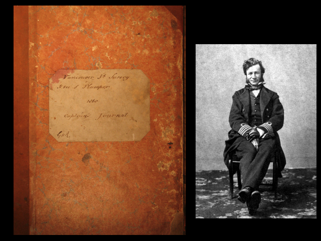 I didn't know what it was. And it was a chart chart room onboard, but the ship was very small. And it was pretty much impossible to do chart work on the onboard. So in winter, they went to a swim and did the charts, small cuts that were built on the shore at the time. So by the end of 1859, before the journal began, surveys had been done on the Gulf Islands, the straits much in Georgia Strait, Vancouver, where are the Fraser north, up to the hidden side of the coma. So when he begins the journal, he's done a little bit of surveying. But he's found that it's going to be impossible to continue because the plumber will only do six and a half knots and the tides and waters are running up to eight knots as you go up into the farther north, so it was impossible to really use the Plunker to continue so he wrote back to everyone Washington, who was hydrographer requesting a larger, faster ship, eight to six to one reward.