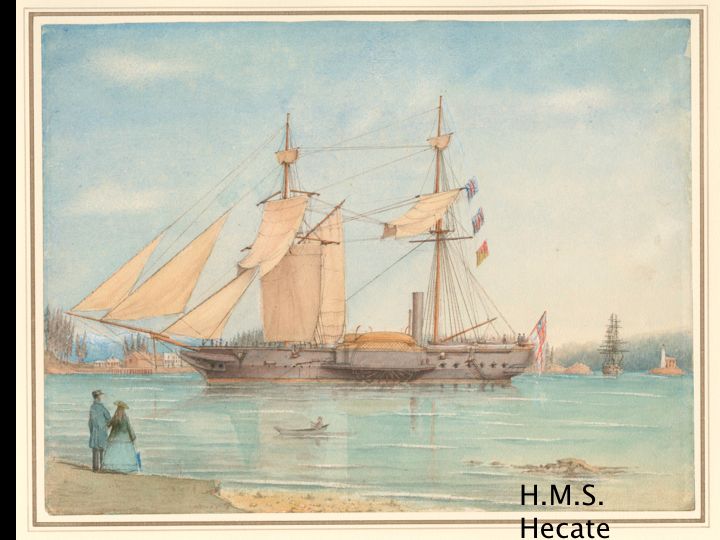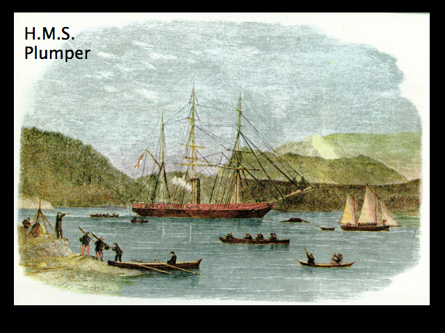 BHMS packet, which was an older ship from the bumper, but a much larger one that had it was an eight to 810 ton 240 horsepower paddle ship had a compliment in 125. And when they had that arrive, Garland garland wrote, she was rather an old crap built in 1839. But by no means ugly. She is the most roomy, comfortable ship and practically adapted to serving purposes. Our firing is quite a palace compared to the one we have just left and we can dine 12 The table without any inconvenience. Apparently on the plumper, which was a screw propeller. The ship was when the sales were up, they would screw the propeller back up into the ship and right into Richards cabin. So I think they were quite flat to get a bigger ship. And from then on, they did the charter right on board as they were doing the survey. So this is a painting of the pearl package just eight months after it arrived, hit the rocks off in the Strait of Juan de Fuca. And a lot of damage was done to the hole. So it was taken for two weeks, two months. At that time, the only driver on the Pacific coast was Cisco Mare Island. And so they took it and Richard spent two months there in which he has a really great count in his time in the wild west of San Francisco. It's very humorous, a little disdainful of American way of life. This is either the American Civil War or the British and the Americans are having very tense relationships anyway. So he was also doing a little looking around down there just to see how well the hardware could be defended, but it could be taken so there's a certain amount of correspondence so just that he was on a stagecoach drive and at one point he writes to give you an idea of the type of writing he does. He says I had a drunken man on each side of me he went to sleep with a head on either shoulder, rather well looking younger and opposite but very thick boots on. She composed herself to sleep with her head on her sweetheart shoulder and her boots on my lap. I was pretty comfortably
