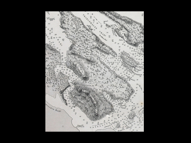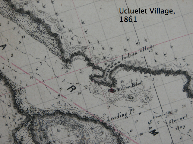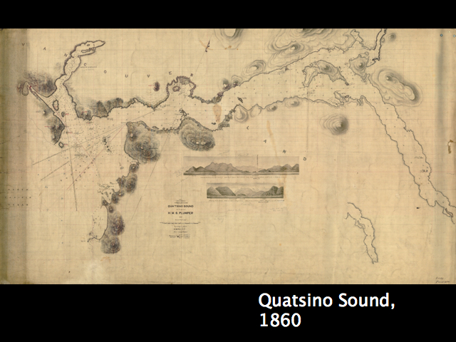 But this is one of the charts that that we got Taunton. This is a question of sound and 1816. And while he was here in five years, he compiled 36 charts in the mainland, wrote the first bank pilot with the sailing directions for the island. So the charts are in great detail, it's hard to see. But they know hazards and they often have landscape sketches. Judge locations the survey work was done in the early spring and the late fall, and a lot of to and fro up and down the island, they have to continue to return to denial in order to my getting there, we're continually having to call at Nanaimo. So they would go somewhere to go back. It would have to go north, it would have to come back. That wasn't just some kind of simple circumnavigation around the island, back and forth. And plus he was continually going over to the Fraser River and back and setting up markers and working on the boundary. He grumbled a lot about the coal facilities and society were a bit appalled to hear how bad the conditions were. And he was, they were always last in line. really annoyed switches. So when we were looking at this type of charts, we're looking for something really quite specific. Because we were working for First Nations, we were looking for signs, made a presentation. On these original charts, this is a very small detail, a very large chart. You'll see Indian village. And when these charts were engraved and published, all that detail was lost on them. So when you look at a published version of the map we don't see, sometimes you might see village but you won't see the houses and all of those rectangles are Indian houses. So this is specifically why we were there, and what type of research we were doing