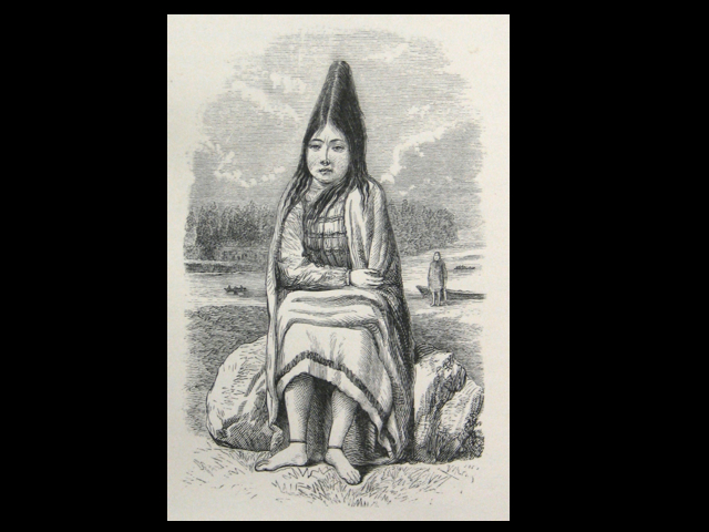 this is, because in our religion photograph was taken in 1870, so about 10 years later, but it gives an idea of the people that were there. And garland writes quite a lot of accounts of the of the maintenance. One of them is about the consumer village. You the Indians who inhabit the inlet are divided into two tribes, namely, casino and Casino. The former by far the more numerous and both are very wild, savage looking chaps. Unlike any other tribes we have met, they allow their beard and mustache to grow, which adds considerably to the wildness of their appearance that are perfectly naked. The shape of the heads of the savages is the most curious of the article, when young abandoned being passed, taking rounded above the forehead, compressing that part so much that the greater portion of the skin is squeezed into the crown, and they take the form of the most perfect sugar. We measured round but one of the most remarkable was a little girl 12 years old, and burned. My eyebrow up to apex of her cranium was 18 inches, laid off on paper with the proper angles, etc. It was the most remarkable object. We traded for salmon, deer, etc. For me and nothing, it appear not to know the value of anything. And for a small because so could obtain three or four or five, weighing from 12 to 14 pounds each. And this is a drawing that was made of girls have they managers? Yes, because who was a 12 year old girl became very fond off at one point, there was a suggestion that should be taken to Victoria to be educated.