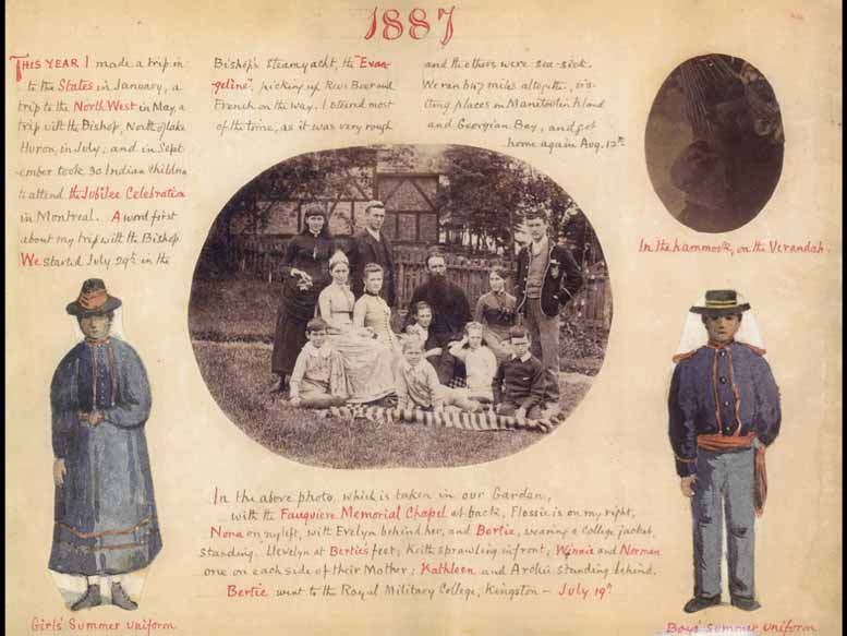 I'm a researcher and not a computer have pointed the wrong thing. Go I can carry on talking to you though. The next slide is the other half of this painting, just to show the details of what you can do. And then the next one friend, is we're going back in time to 1888. So the first one was 1901 when they were grownups, and this is when their children in their app. They're seeing walk home in Sioux Sainte Marie, and we're having a good time having breakfast. Okay, so this is what, where this family came from? Sioux Sainte Marie, and why did they come? Why? Why were they there? Well, it's all to do with this man here. The one who's sitting on the bed. He's called chief Xing lock. The British called them little pine, because that's what Shinhwa means. And his father called him Agustin Agusto. And the British then changed that the missionaries then change that to Augustine. So I hope I'll just call them chiefs in walk for now. This sketch, I'm reading what Reverend Wilson wrote in his journal. This sketch shows cheap little pine Shin walk after her machine walk home was named in his own home with his wife and children at Garden River. It may be said that cheap shingle originated the idea of this Indian institution, from which a great many writers and people studied in residential schools say that Chief should walk originated the residential schools. It was in the summer of 1871 that he left his home and started on a journey of 400 miles to Toronto and other Canadian towns. His object been to tell the white people what his own poor people needed, and to ask that something might be done for the education of their children. The chief could not speak a word of English, but he asked me that's Reverend Wilson, to accompany him and interpret for him. I want you to take in the fact that Reverend Wilson was completely fluent in a jib way. He even wrote a grammar and a dictionary to teach other missions. He's, but instead of doing that he used it himself within his school to teach the children to read their own language and to learn English by using the dictionary to translate Ojibwe into English. So he was not a person who forbade them to speak their own language by any means. That is something that happened in residential schools a great deal. It's not how Reverend Wilson started. So I'm not going to read everything where he pours his heart out, but I'm going to try to remember some of it. Yes, okay. So the globe, yet, okay. I'm going to give you a slide that shows you the extent of the British Empire at this time, which will make you understand why he says what he says next. You are a strong people, you are becoming stronger and greater every day. Our Great Mother, the Queen, that is Queen Victoria is like the rising sun in her strength, no one is able to resist her. But we poor Indians are very weak. We are decreasing in number, from diseases brought by the set new settlers, we no longer have our lands that because the settlers took them over, or our hunting grounds, likewise, which our fathers used to have, they've been put on reservations. All the country is now possessed by the white people. And we are driven back, I was addressing an old man, he was in his 70s, he actually went on to live into his 90s. I do not expect much longer to live. It's not for myself that I come to speak to you, but it is for my children and my grandchildren, it is no longer possible for them to live, as our fathers did by hunting and trapping. If they are to exist at all, they must learn the ways of the white people. This then I asked you to build for us at Garden river, a big teaching Wigwam where our children may be taught to do everything the same as white people.